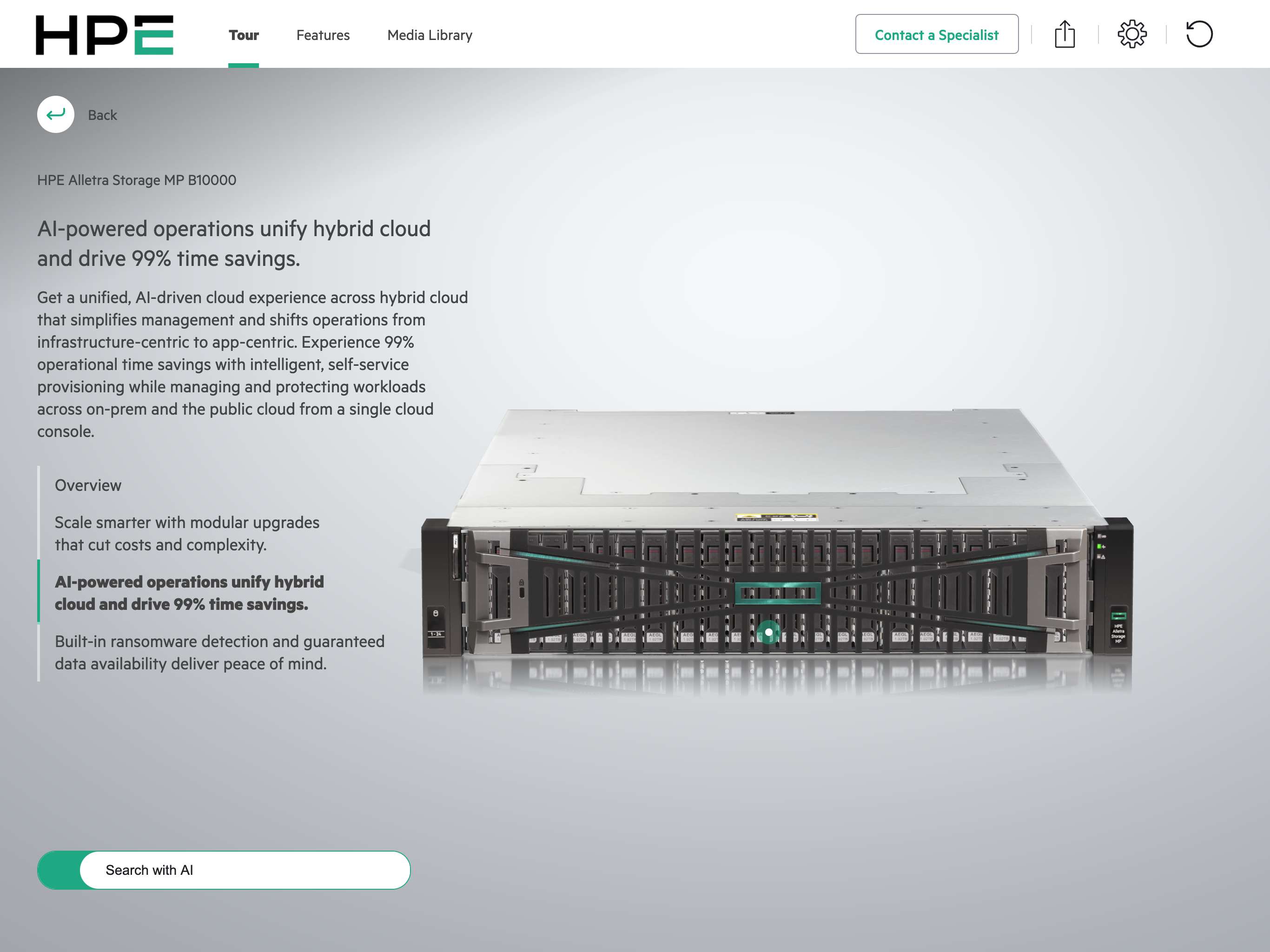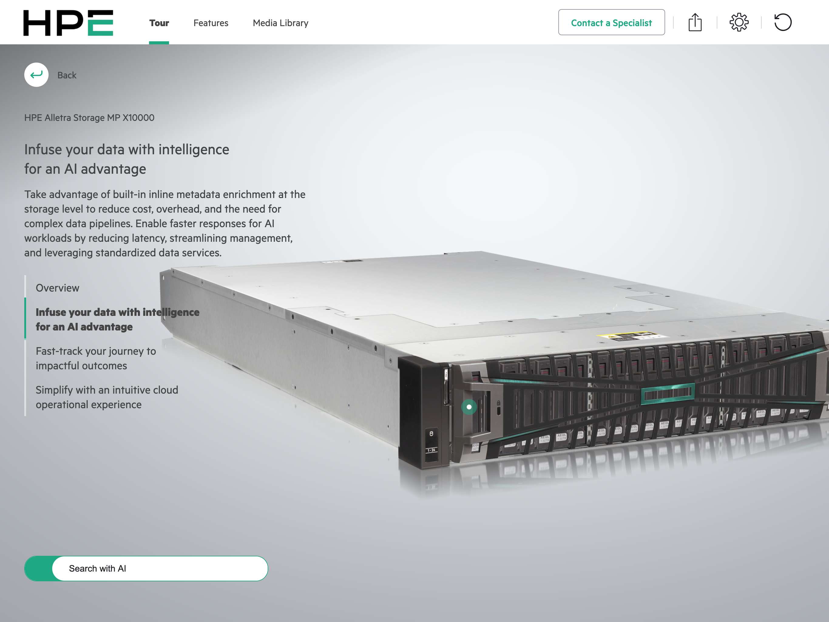 Tour HPE Storage solutions, including HPE Alletra Storage MP B10000 and HPE Alletra Storage MP X10000, in an interactive 3D experience on tablet, smartphone, or browser. View and learn about the cutting edge HPE Storage products with standard as well as enhanced product tours.